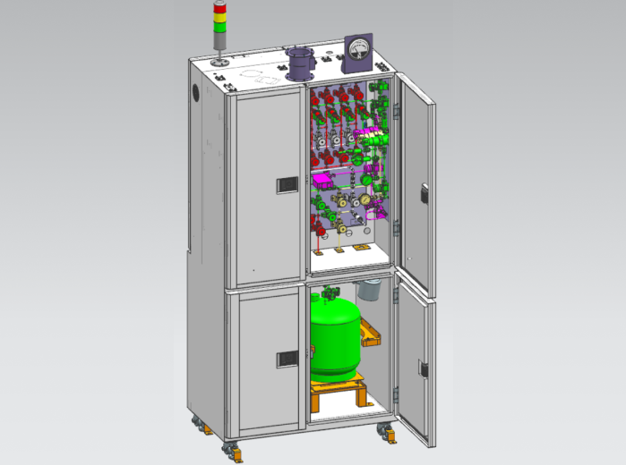 The source bottle supply evaporation cabinet is equipped with a liquid source liquid storage tank (or cylinder) to supply the source liquid, and the source liquid outputs a certain proportion of steam after evaporation through the evaporation system. The equipment mainly includes gas-liquid control valve group panel, evaporation system, PLC controller, safety accessories, electronic scale and cabinet, which realizes the automatic supply from the source input to the terminal equipment.
